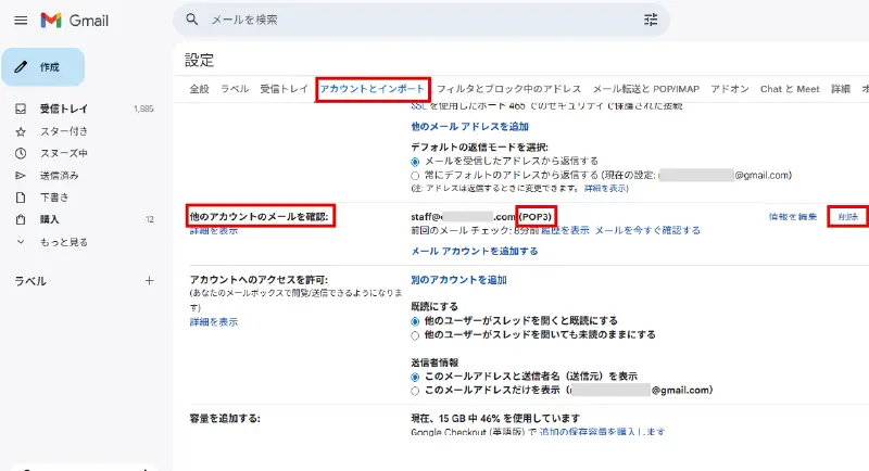 - 【(POP3)】と表記がある場合は、右側にある【削除】を押して消します。