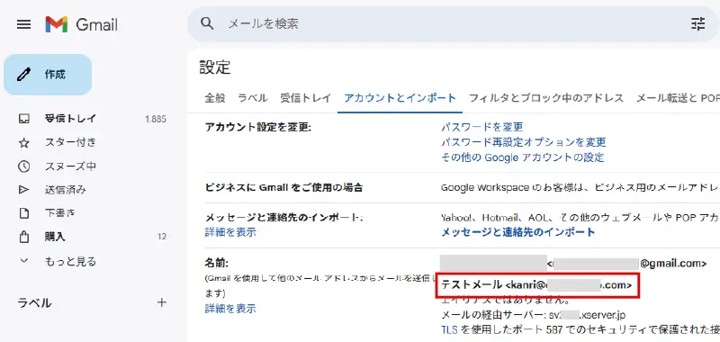 - 「名前」の項目に追加したメールアドレスが表示されていればIMAPの設定は完了です。