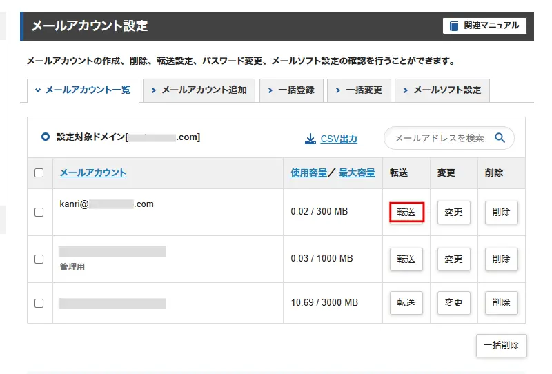 - 「メールアカウント一覧」から対象のメールアドレスの【転送】をクリックする
