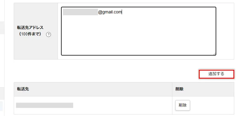 - 「転送先アドレス」に送受信したいGmailアドレスを入力する