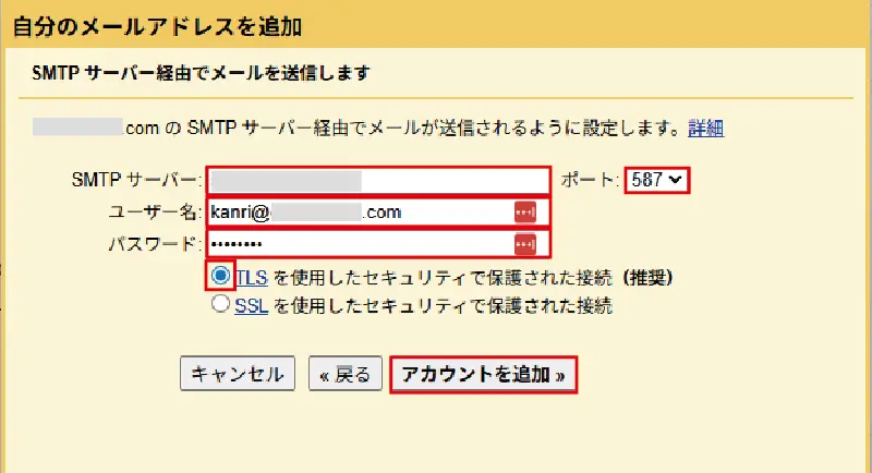 - SMTPサーバー:メールサーバーに記載のIMAPを入力する