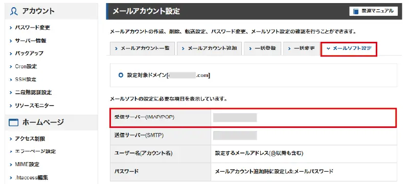 - 【メールソフト設定】タブを選び、「受信メール(POP)サーバー」項目のsv****.xserver.jpを貼り付ける