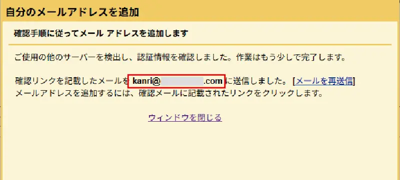 設定したメール宛に「確認リンクを記載したメール」を送信しました。と表示されます。