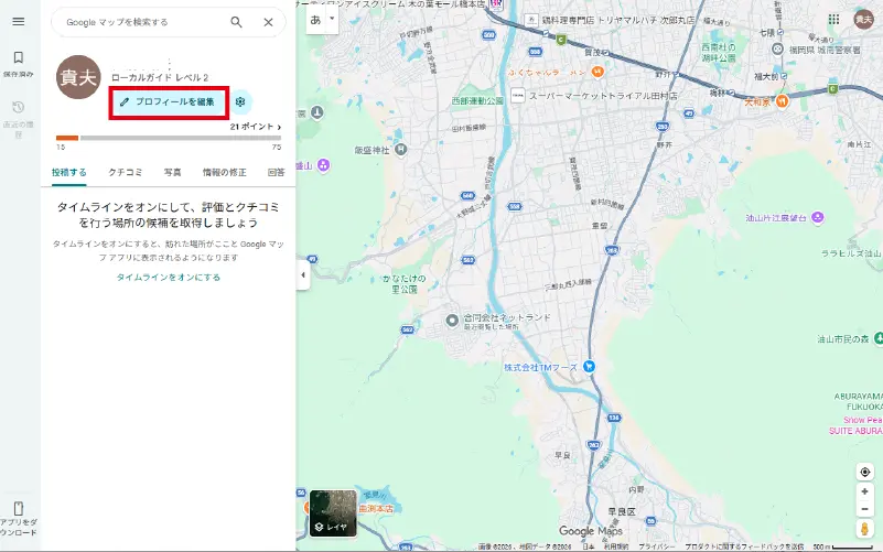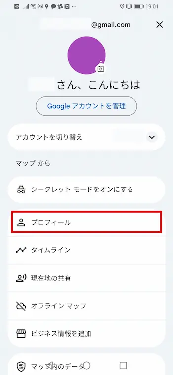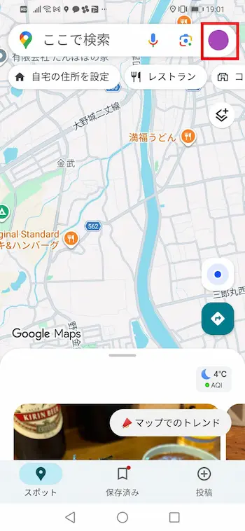 Googleマップを開き、右上に表示されている丸いアイコンを開きます。