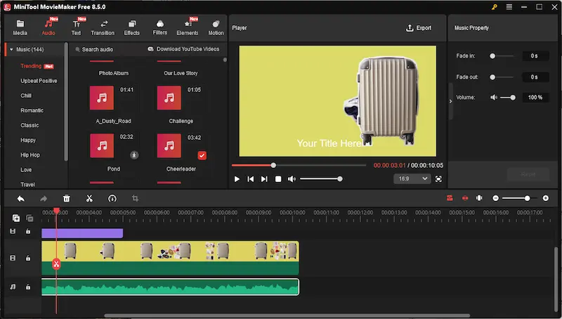動画の印象は音で変わります。MiniTool MovieMakerは、BGMが準備されていてカーソルを合わせるとどのような曲か確認できます。音楽を入れたいときはドラッグ&ドロップで追加するか、「+」マークを押すとタイムラインに反映されます。